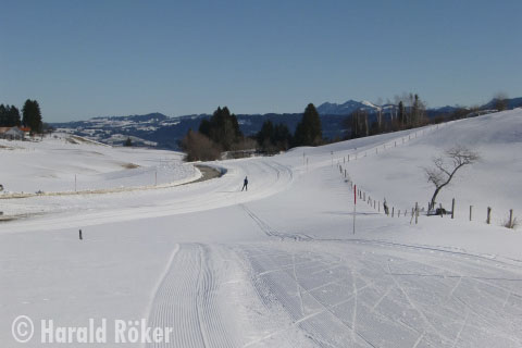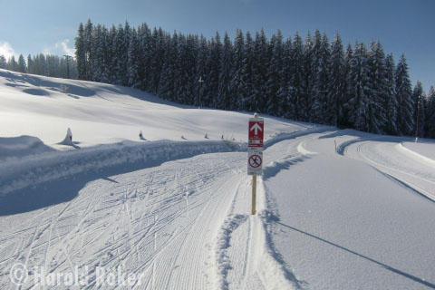Zu Anfang geht es harmlos, erst noch im Freien, dann auf einem Waldweg, sanft an- und absteigend dahin. Kaum gelangt der Weg wieder ins Freie, nimmt die Steigung zwar noch sanft aber kontinuierlich zu. In diesem Bereich verläuft die Loipe an einem südlich ausgerichteten Waldrand, so dass an sonnigen Tagen der Schnee hier oft schnell weich wird. Nach einigen Metern zweigt die Loipe dann abrupt nach links ab und wird ansatzlos steil. Die erste Kurve ist meist noch einigermaßen erträglich und wird gleich von einem geraden Stück abgelöst, das dann allerdings direkt in eine zähe, steile langgezogene Rechtskurve übergeht. Danach ist das Schlimmste schon fast überstanden, zumindest, wenn man sich noch etwas Luft aufgespart hat. Immer noch deutlich bergauf geht es kurz geradeaus, dann folgt nochmals eine leicht hängende Linkskurve. Danach wird es zum Glück flacher und man kann wieder etwas Atem schöpfen, bevor eine nochmals etwas steilere aber zum Glück nicht allzu lange Passage zum zunächst höchsten Punkt der Runde führt.